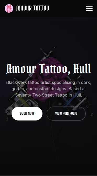Amour Tattoo operates from Seventy Two Street Tattoo in Hull, specialising in blackwork, gothic, and custom tattoo designs. The artist came to me with a problem that's painfully common for independent creatives: everything was separate.
